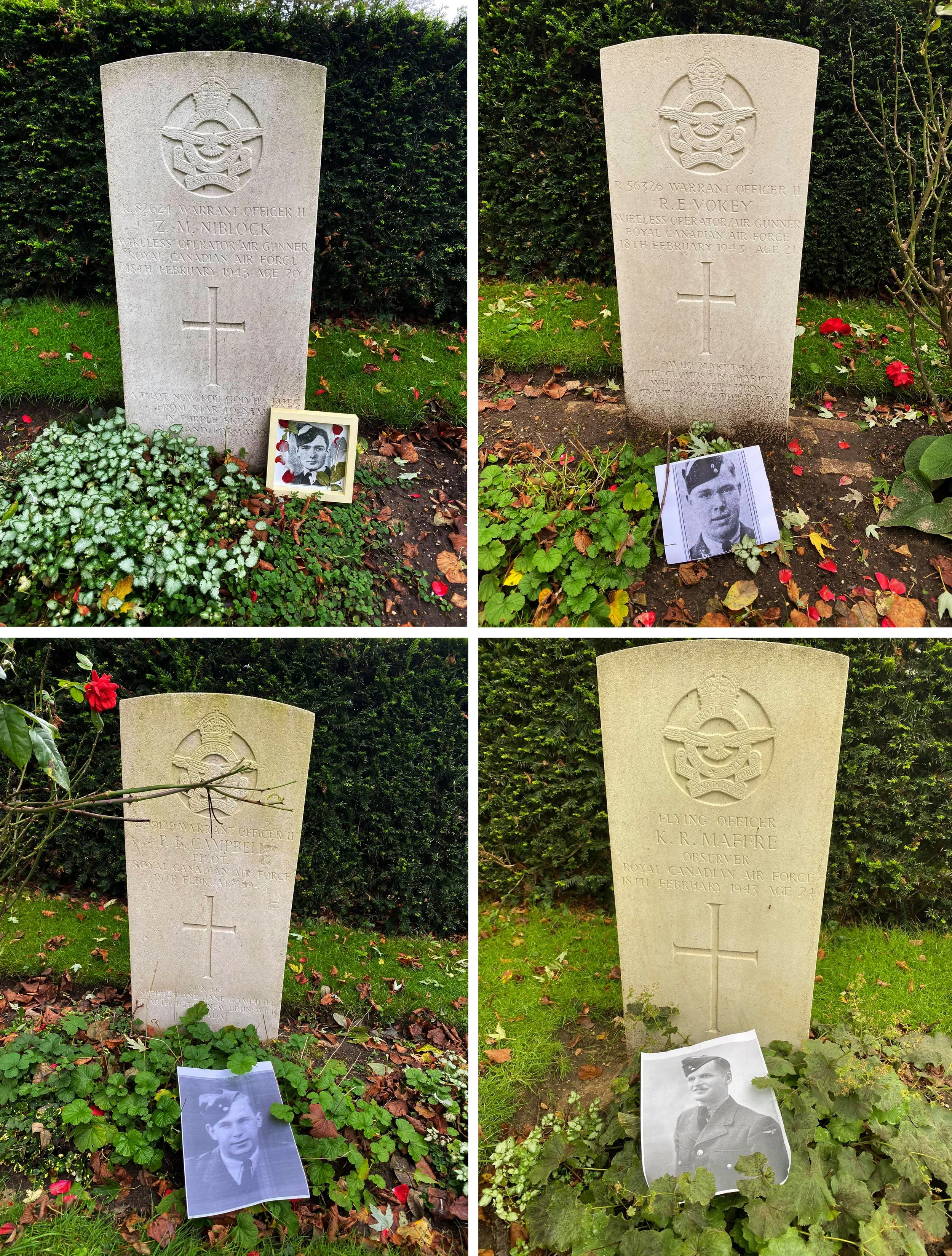 My dear friend Jay Pinto, visited Great Bircham (St Mary’s)Church Cemetery in Norfolk in 2020 and photographed the headstones of the four men of Hampden “U for Uncle” who have now lain there for more than 80 years. The photos that he placed among the flowers of their graves show us so vividly the meaning of the words “They Shall Not Grow Old.”. We never got to know them as old men, as old warriors steeped in duty, humility and honour. They are forever young men. The framed image of Manny Niblock (Top Left) with rose petals from his graveside, now sits in my office, three feet from where I write this. Photos: Dr. Jeroen Pinto
