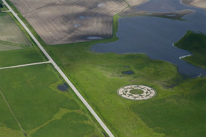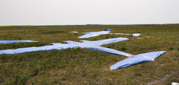 From a moving car, Gravitas looks more like some junked and rusting farm equipment than a tribute to the young airmen of the British Commonwealth Air Training Plan (BCATP). From the air, however, there’s a quite different story. Gravitas takes the form of a 75-metre-diameter compass rose with the full-size planform outlines in prairie grass of twelve Avro Anson aircraft pointing inwards towards an open circle of prairie grass. Each of the twelve Anson shapes embraces parts of actual former Anson aircraft of the BCATP. The entire work is made from gravel and grass. It is designed to be consumed by the landscape that gave it birth.