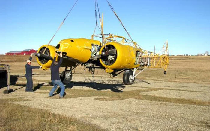A deteriorating Anson hulk is lifted from the Bomber Command Museum's storage yard at Nanton, Alberta. Photo via Keith Harder
