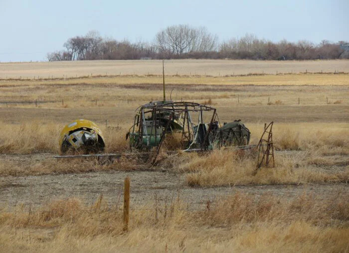 Another hulk is lifetd from a flatbed truck at Cayley. Photo via Keith Harder