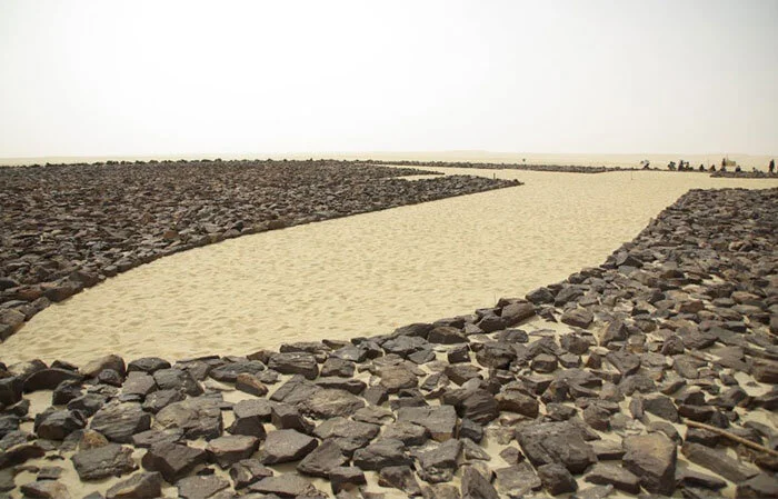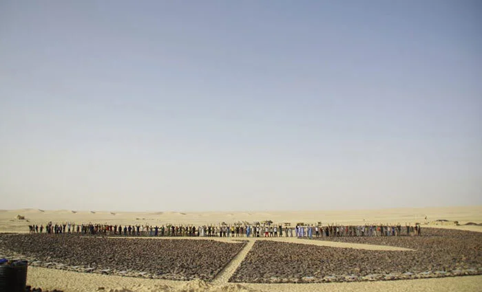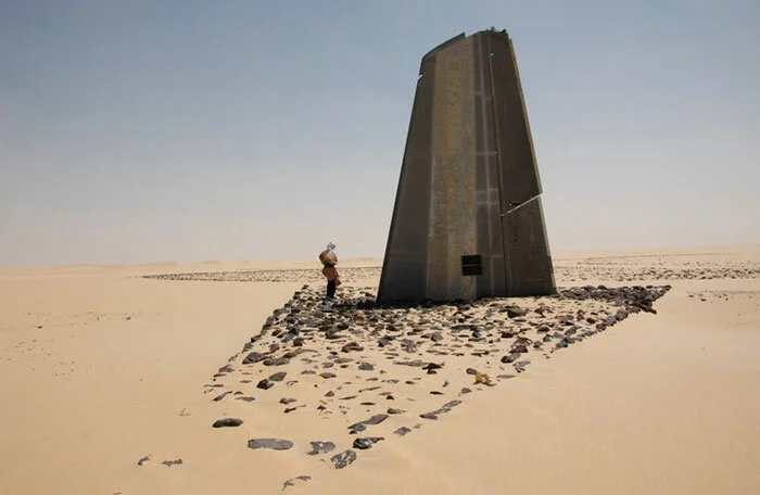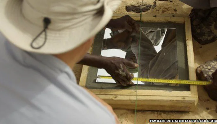 In the heart of the memorial, black Saharan rocks, trucked from the Aïr Mountains, form the outline of a DC-10. From the back of the DC-10 three contrails representing the aircraft’s three engines give the impression that it is forever heading north-northwest towards the beauty of Paris, the City of Lights. The memorial is described by Design for Conflict Heritage (a website dedicated to memorials to tragedy and conflict): “The memorial, partly financed by a compensation fund paid to the victims by the Libyan government, was built by 100 people working largely by hand under the desert sun. A black circle of about 200 feet in diameter, created by placing stones on the sand, outlines the life-size silhouette of the aircraft. Around the circle were placed 170 broken mirrors—representing the victims—and arrows marking the different points of the compass. At the northern point, part of the right wing of the plane—found 10 miles away—has been driven into the ground, with a plaque commemorating the victims. The memorial reflects the need to leave a permanent trace of this tragedy, despite an inhospitable geographic condition. The aim is to build some kind of still frame visible virtually worldwide. However, the interest of this project lies not only in its architectural features, but especially in the painful participation process and collective commitment that produced it and which can still be found in the actions carried out by the Association. In addition to the desire to keep alive the memory in the international public opinion, the actions aim to offer moral, material and financial support to all the victims of attempts and their families.”