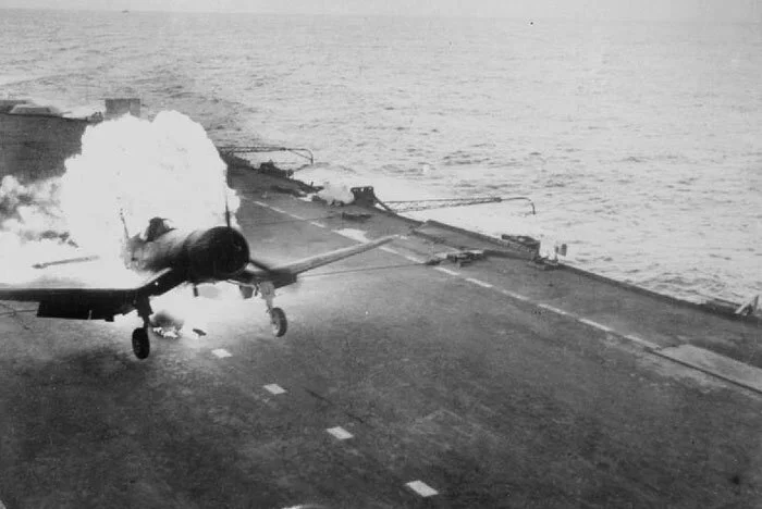 Corsairs form up in the distance as a Fairey Barracuda trundles off HMS Formidable. The ungainly Barracuda had a number of weaknesses, but its relatively short range made it unsuitable for the Eastern Fleet’s strikes against the oil refineries on Sumatra. Due to their longer legs and ability to get airborne after a short run, Corsairs typically launched ahead of TBRs. The plume of steam rising at the fore end of the flight deck was intended to give pilots an indication of the wind speed and direction. Photo: Imperial War Museum