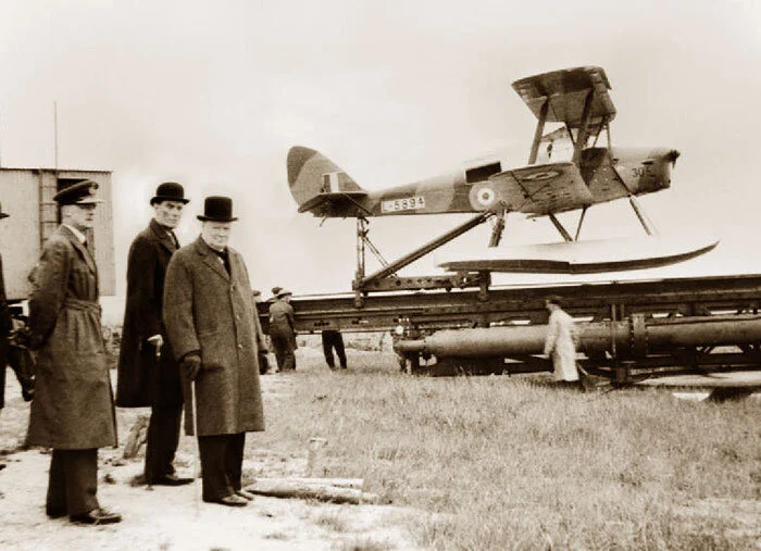 Though Tiger Moth Queen Bees had been in use for some time, Prime Minister Winston Churchill visited a launch site at the Weybourne Anti-Aircraft Artillery Range on the Norfolk coast on 6 June 1941 with Secretary of State for War David Margesson (behind). Here, the unpiloted Queen Bee L5894 is readied for launch from a steam catapult. Navy gunners were unable to or perhaps did not attempt to shoot down this particular drone during the demonstration, for L5894 was listed in de Havilland production logs as having been shot down off Weybourne 12 days later. Churchill made two visits to the range in 1941. During his first visit, a demonstration of projectile firing was carried out, but the result was most unsatisfactory. The Prime Minister gave the commandant just seven days to improve the standard. On the second visit, each demonstration repeatedly ended in failure until finally, a Queen Bee target aircraft was shot down and crashed close to the VIP enclosure. Local history has it that all the senior staff were replaced the following day. Photo via Imperial War Museum