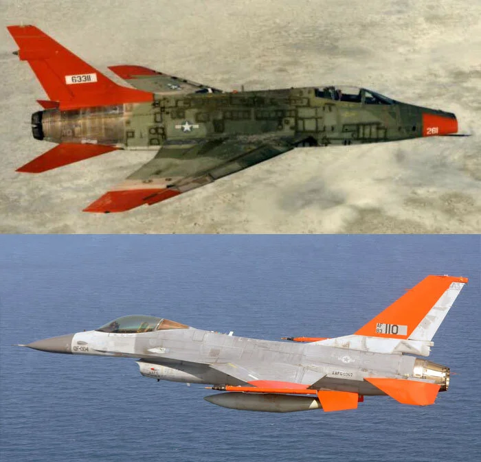 Many of the same technologies and techniques are still employed by drones today including catapults and the painting of wingtips and control surfaces in bright red or orange to assist controllers in visualizing the orientation of the aircraft. Here we see the old Queen Bee paint technique applied to a QF-100 Super Sabre pilotless target drone at top and recently to the QF-16 Fighting Falcon target drone. Photos: USAF