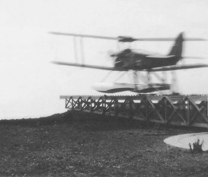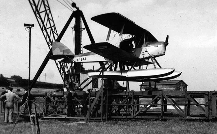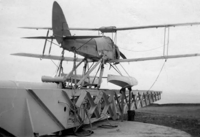 A Queen Bee on floats sits in the cradle on the steam catapult roundtable at the Burrow Head Anti-Aircraft Artillery range in Scotland. The catapult could be rotated to point the Queen Bee directly into the wind. This particular Queen Bee, serial number N1837, crashed into the sea off Burrow Head on 20 July 1939. Photo by Roy Eldridge