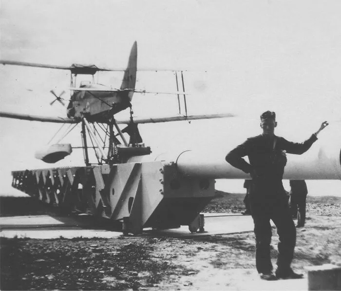 Two views of the Larynx pilotless and radio-controlled aircraft on the forward deck of HMS Stronghold, showing its high visibility paint scheme designed to keep it in view as long as possible. The first launch ended in disaster with the Larynx crashing into the Bristol Channel after only a few minutes. The second flight was far more successful, with a Larynx flying more than 100 miles before it was lost. The third flight went 112 miles and came down just five miles from the intended target—a promising result. Photos via AirWar.ru