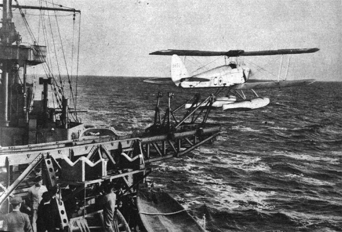 Another pilotless Queen Bee (L7723) leaves the cradle of a steam catapult at a firing range. Many of the Queen Bees were flown more than just the single time, some operating for months. It is hard to tell where this is, but L7723 was lost when its floats collapsed at Malta on 24 October 1939. Photo: everythingexmoor.org.uk
