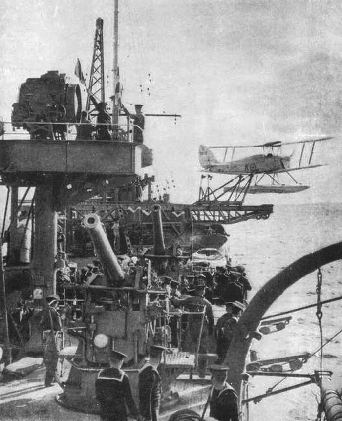 HMS Neptune launches another Queen Bee. Note the sailors congregating on her decks to watch the launch as well as her quick-firing 4-inch Mk IV guns along her sides and trained aft. It is not known whether these guns were employed against Queen Bees, but they were highly capable naval, coastal defence and anti-aircraft guns—capable of reaching aircraft at 28,000 ft. Photo: Royal Navy