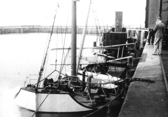 The old Bristol Channel coastal steamer SS Radstock was employed at Watchet, recovering both the wreckage of downed Queen Bee drones as well as those that landed safely on the water. Here she ties up at Watchet with a recovered Queen Bee resting on her cargo deck. HMS Neptune could also recover her own Queen Bees directly with her own cranes. Photo: watchetconservationsociety.co.uk