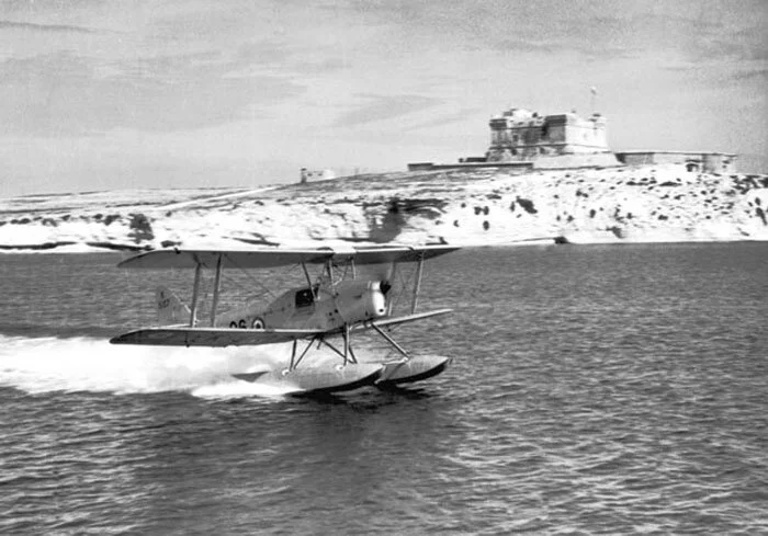 A Queen Bee takes off along a coastal scene that seems somewhere other than Great Britain. The Royal Navy operated Queen Bees from Royal Navy Air Yard (RNARY) Fayid on the Suez’s Great Bitter Lake, RNARY Dekheila near Alexandria and Ta Kali on Malta. Photo via topwar.ru