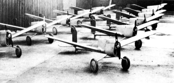 Radio-controlled pilotless aircraft were under development in more than just Great Britain. Some of the “early adopters” included the United States and Nazi Germany. The Germans investigated and eventually produced a number of small un-piloted target and reconnaissance aircraft called the Argus As292. Here a dozen or so of the more than 100 German-built mini-aircraft sit on a hangar floor. The type was fitted with a Zeiss cine camera for reconnaissance work and, when the mission was over, a radio signal shut the motor off and deployed a parachute to allow them to descend to earth. Photo: luftarchiv.de