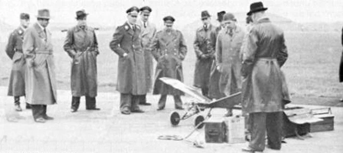 Pilotless aircraft seemed to draw dignitaries in every country, perhaps due to the science fiction-like qualities. Here a group of Luftwaffe and Nazi big wigs, including First World War ace Ernst Udet, standing at centre, look rather unconvinced as they stare down at a diminutive Argus robot airplane. One would love to know what the great pilot thought of a future without him. Today, Germany is one of the great producers of Unmanned Aerial Vehicles or Drones, as we have now come to know them. Photo: luftarchiv.de