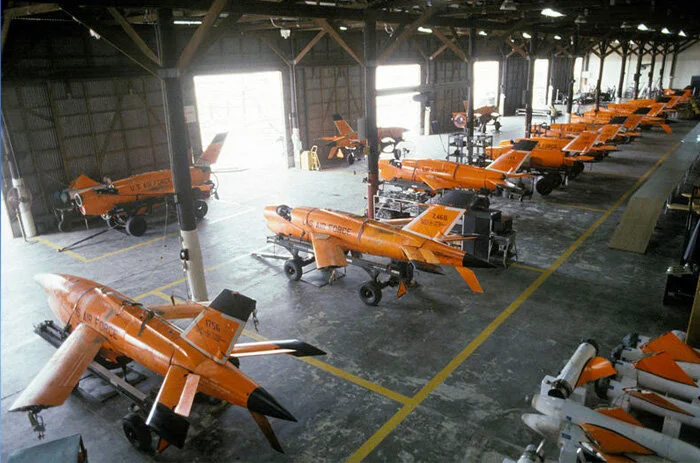 Jet-powered Firebee target aircraft are stored inside a Teledyne-Ryan service hangar in 1984. By this time, pilotless aircraft used for targeting and reconnaissance were now called “drones”. The Ryan Firebee was a series of target drones developed by the Ryan Aeronautical Company beginning in 1951. It was one of the first jet-propelled drones, and one of the most widely used target drones ever built. In the late 1990s, Teledyne-Ryan configured two Firebees with cameras and communications equipment to feed real-time battlefield intelligence for targeting and damage assessment. In an ironic twist, these drones were named “Argus”, possibly as a nod to its diminutive German predecessor, the Argus As292. Photo: USAF