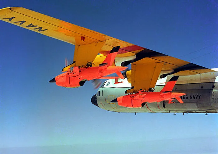 Typically, Firebee target drones were released near the firing range from motherships like this US Navy DC-130A Drone controller, capable of carrying four underwing Firebees. The US Navy’s Herc motherships operated from the Southern California Operating Area, flying missions from NAS North Island and Point Mugu. The DC-130 could launch, track and control the Firebees in flight. Photo: PHCS R.L. Lawson, USN