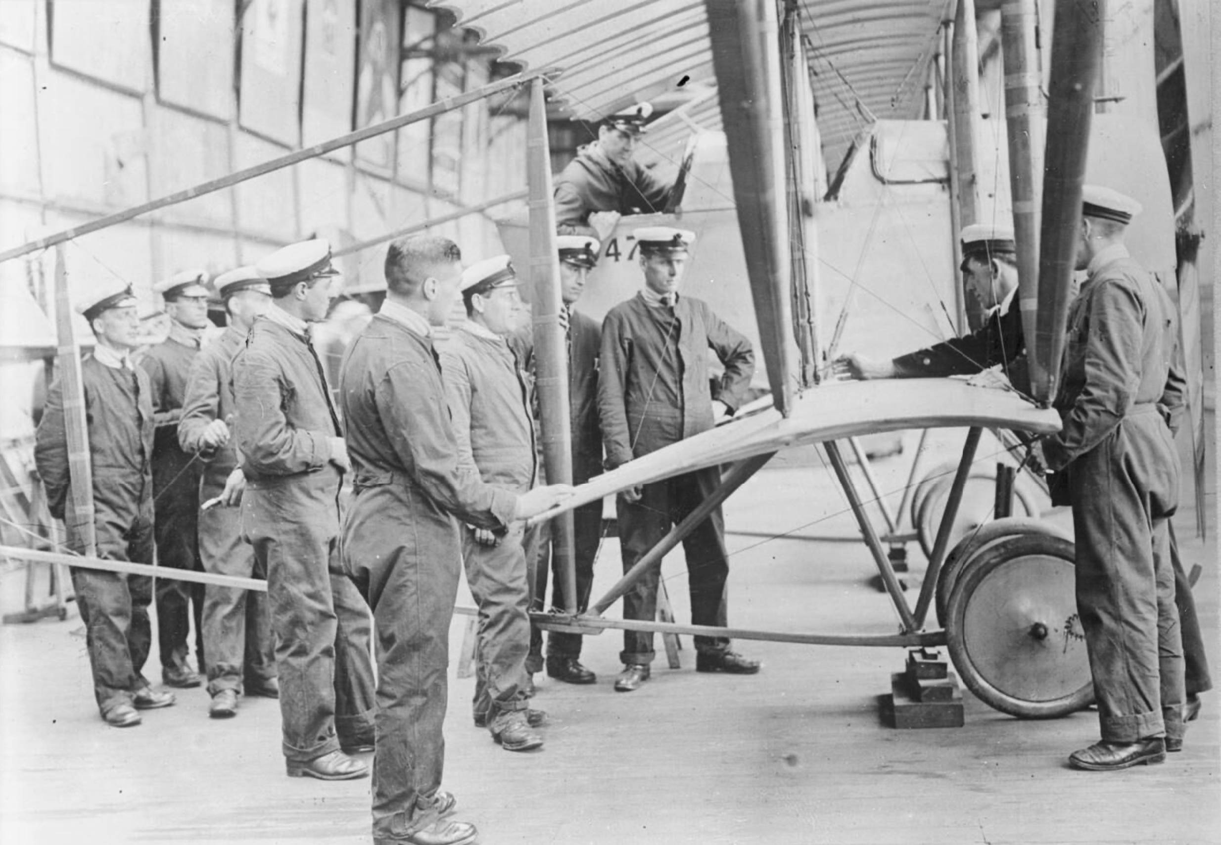 Probationary Flight Sub Lieutenants get a beginner’s lesson on the Caudron biplane at Crystal Palace. Photo: Imperial War Museum