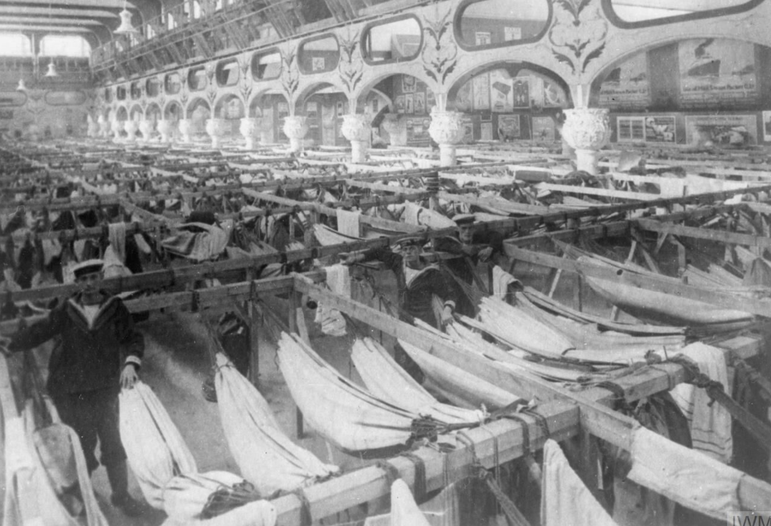 Life for a raw recruit in basic training at Crystal Palace was not for someone seeking privacy as witnessed by these endless rows of hammock sleeping accommodations. Photo: Imperial War Museum