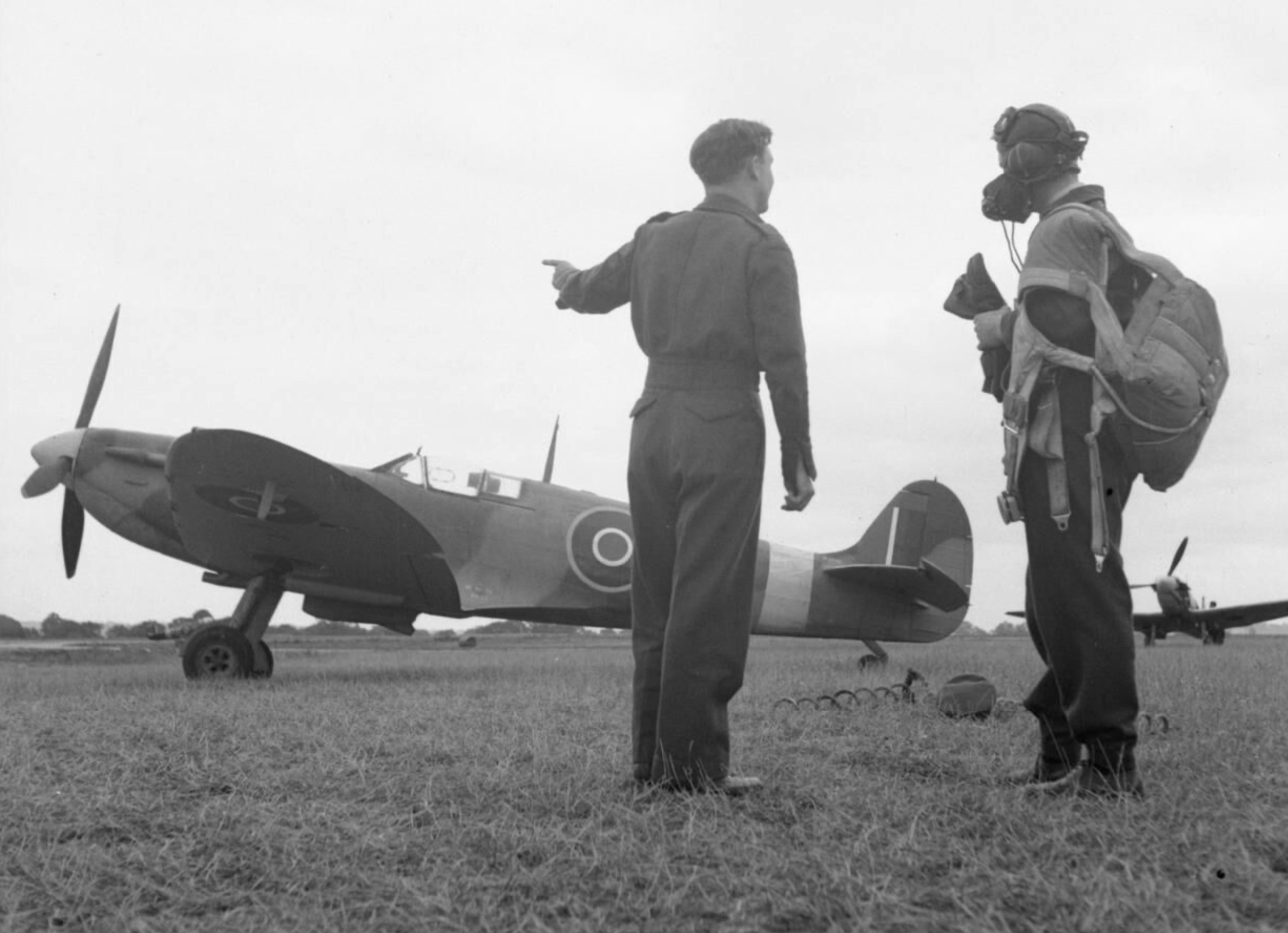 A newly-qualified pilot is introduced to the Supermarine Spitfire, a Mark IIB, P8315, by his instructor at No. 61 Operational Training Unit, Rednal, Shropshire. Photo: Imperial War Museum