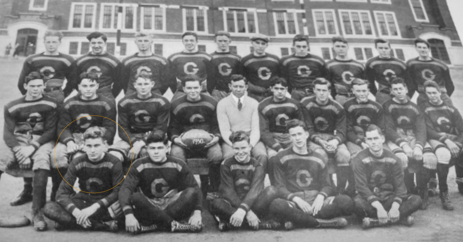 The Glebe Collegiate Institute Gryphons junior rugby football team in their blue and gold uniforms pose in November of 1930 in front of their school building with 16-year old Gordon Darling sitting at left. They had just beaten a team from Pembroke in a sudden-death play-off. This qualified them to play against Kingston Collegiate in the Eastern Ontario Secondary School Athletic Association (E.O.S.S.A.A) football final at nearby Lansdowne Park. Darling played outside wing in this, his first year of collegiate rugby football. They won the game 15 to nothing.
