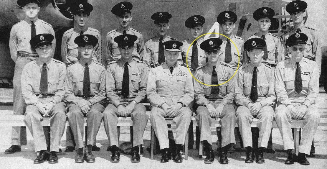 A group of uniformed civilian aircrew working for RAF Ferry Command pose formally with Air Chief Marshal Sir Frederick Bowhill, commander of Ferry Command in front of a Ferry Command Liberator. Captain Nat Tooker is circled. Photo thanks to Donna McVicar-Kazo