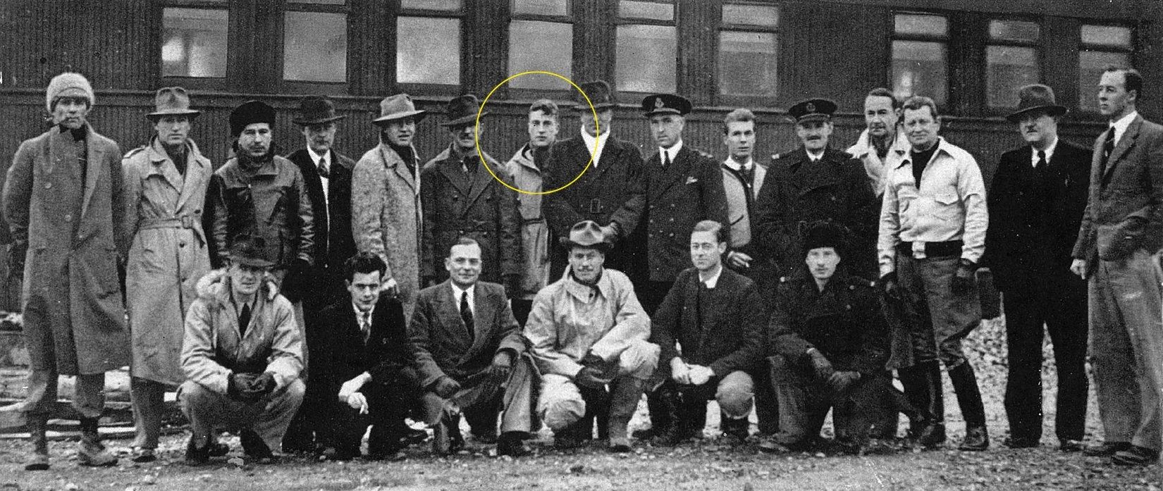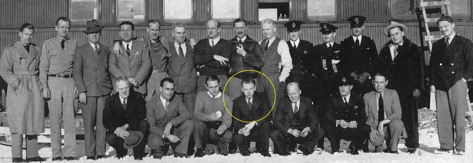 Another group of civilian Lockheed Hudson transatlantic ferrymen with J. R. Fraser, the navigator aboard FD773, circled. The lead aircraft, with Fraser aboard, was piloted by Captain Humphrey Page (far right). Photo thanks to Donna McVicar-Kazo