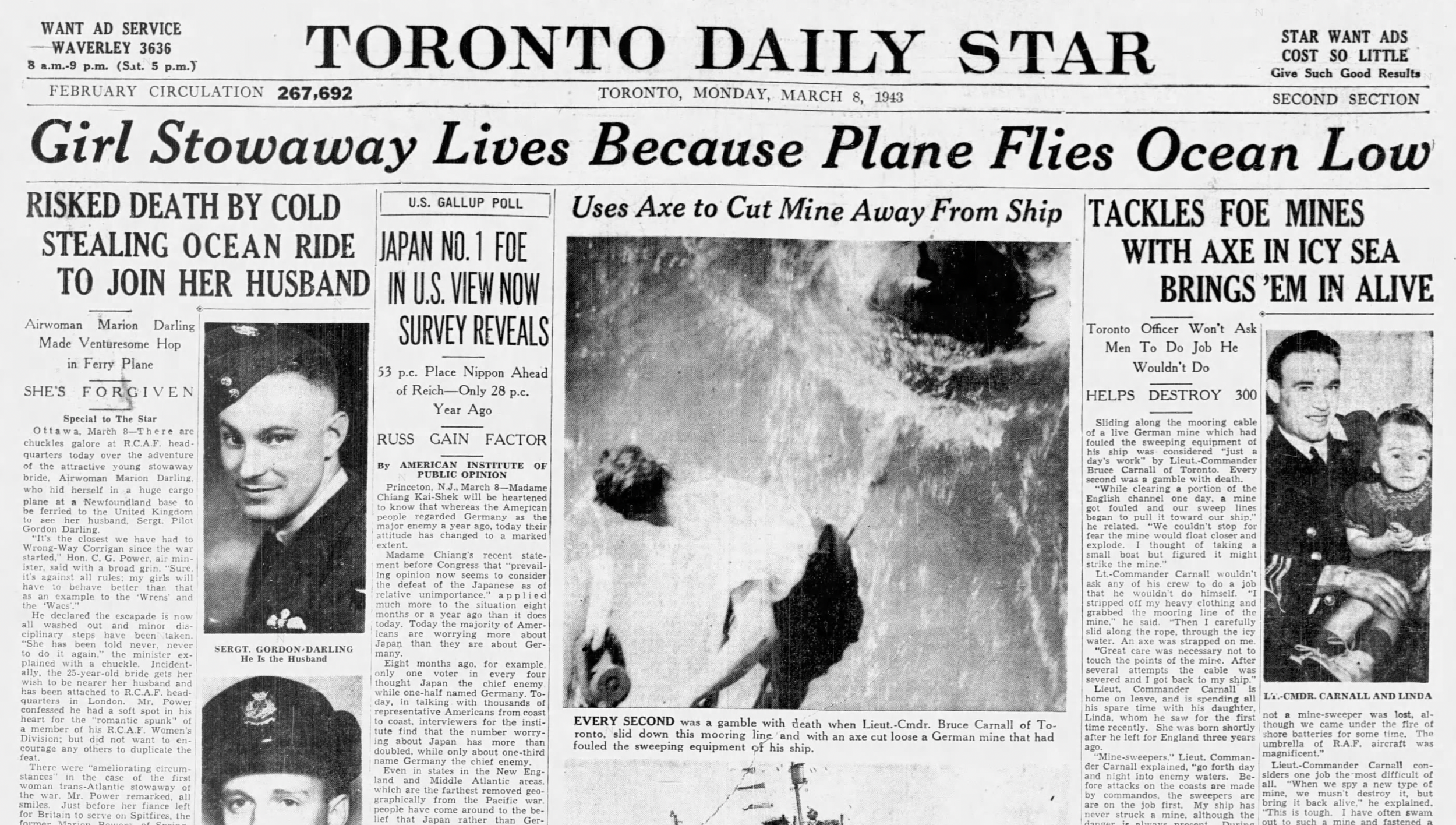 A report of her discovery over the Atlantic made it all the way to the Ottawa desk of the Right Honourable, Charles “Chubby” Power, Minister of National Defence for Air. It would be his decision as to whether Marian would be made an example of to discourage copycats and what her punishment should be. Certainly there were articles in the King’s Regulations and Orders that would cover such an event. The story was kept secret for a month before being released to the world’s press — perhaps waiting for the happy ending Marian wanted..